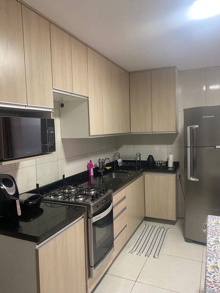 Cozinha com armários planejados e banco que acompanha o estilo dos armários, acabamento nas paredes da área da pia, piso em porcelanato.