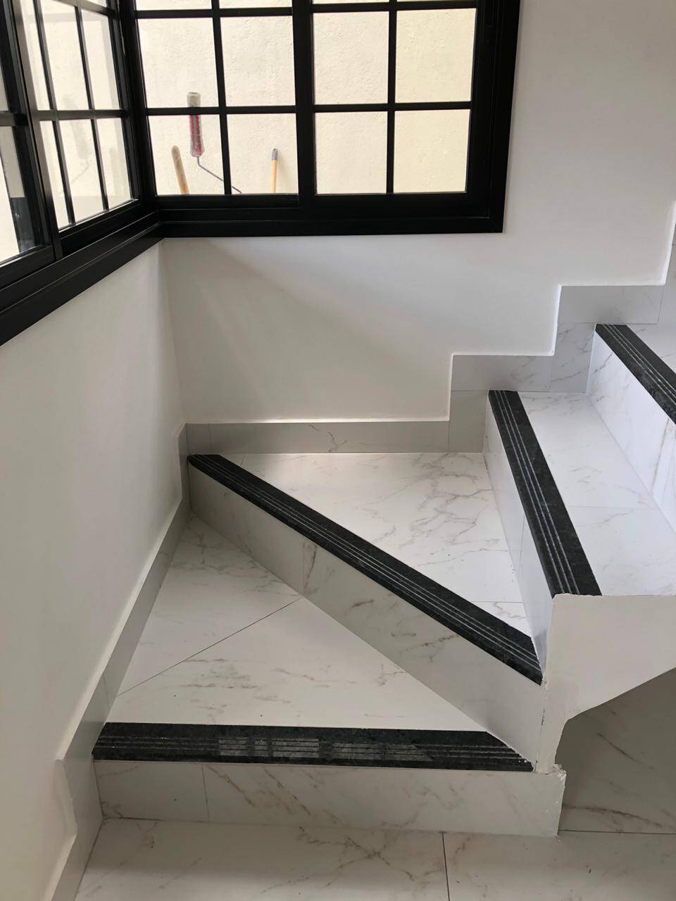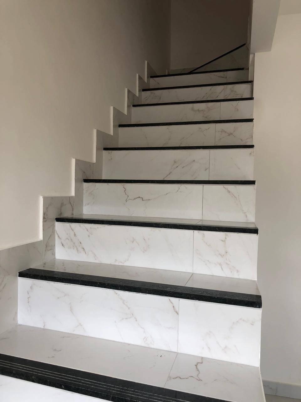 2 nível: escada de acesso em alvenaria revestida em porcelanato; 03 quartos, sendo 01 suíte; banho social e banho suíte com bancada em granito.