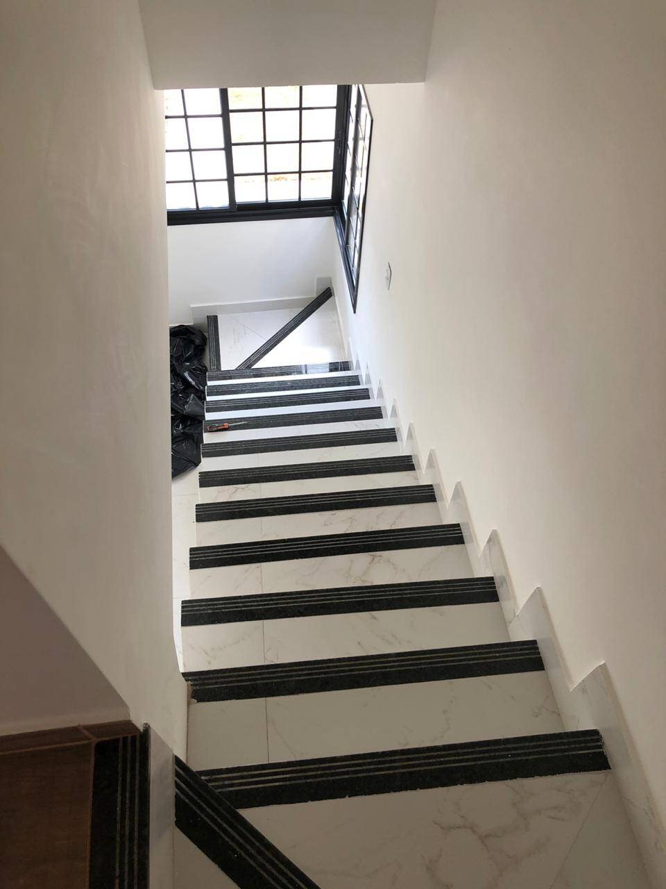 2 nível: escada de acesso em alvenaria revestida em porcelanato; 03 quartos, sendo 01 suíte; banho social e banho suíte com bancada em granito.