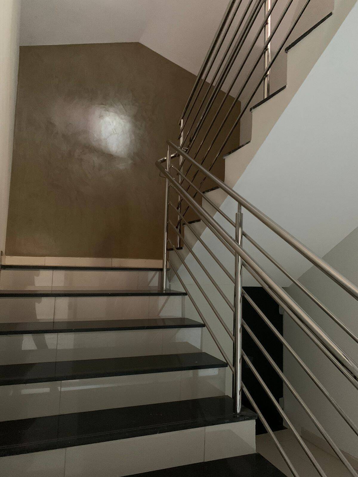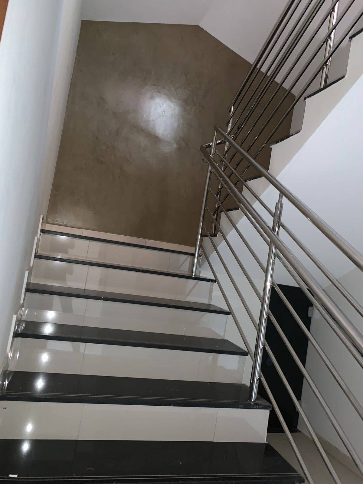 Cozinhas planejadas com bancada de Granito Preto São Gabriel, corrimão das escadas todos em inox,