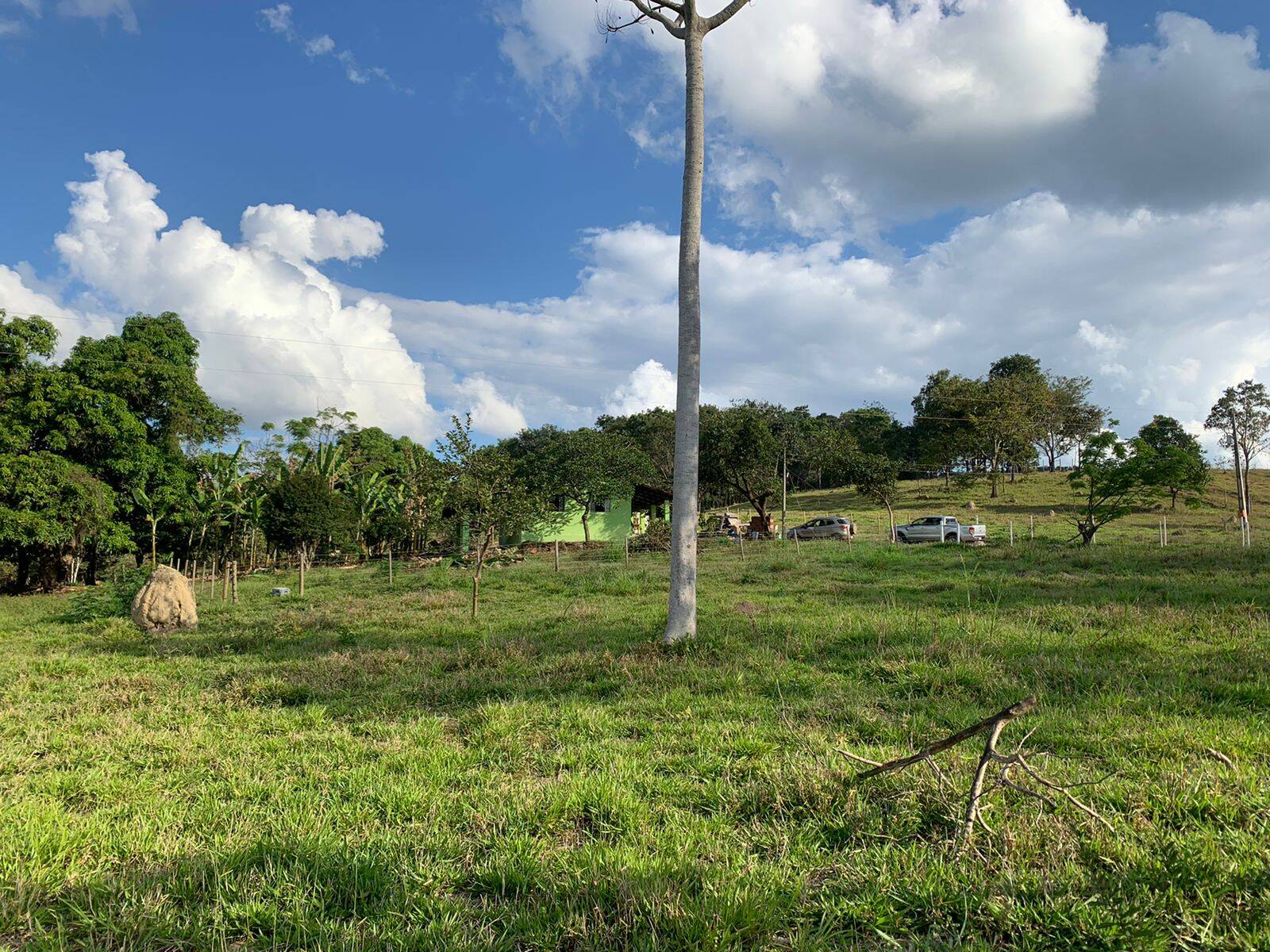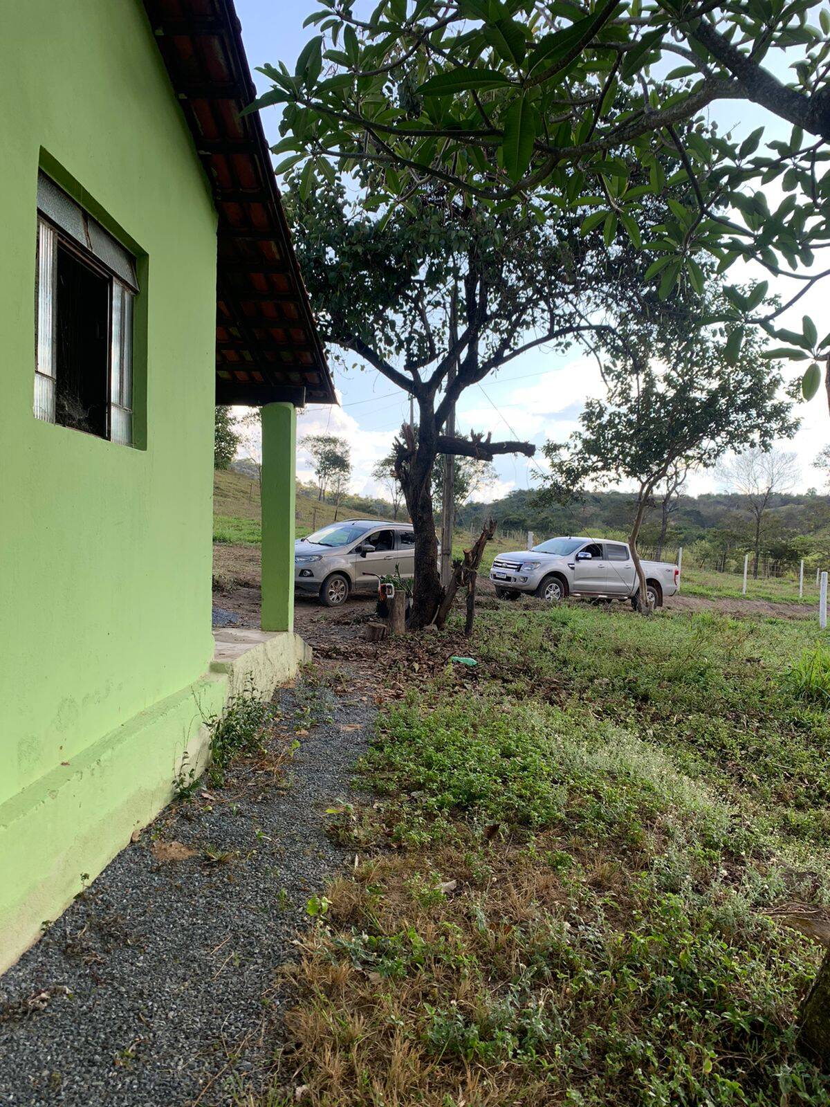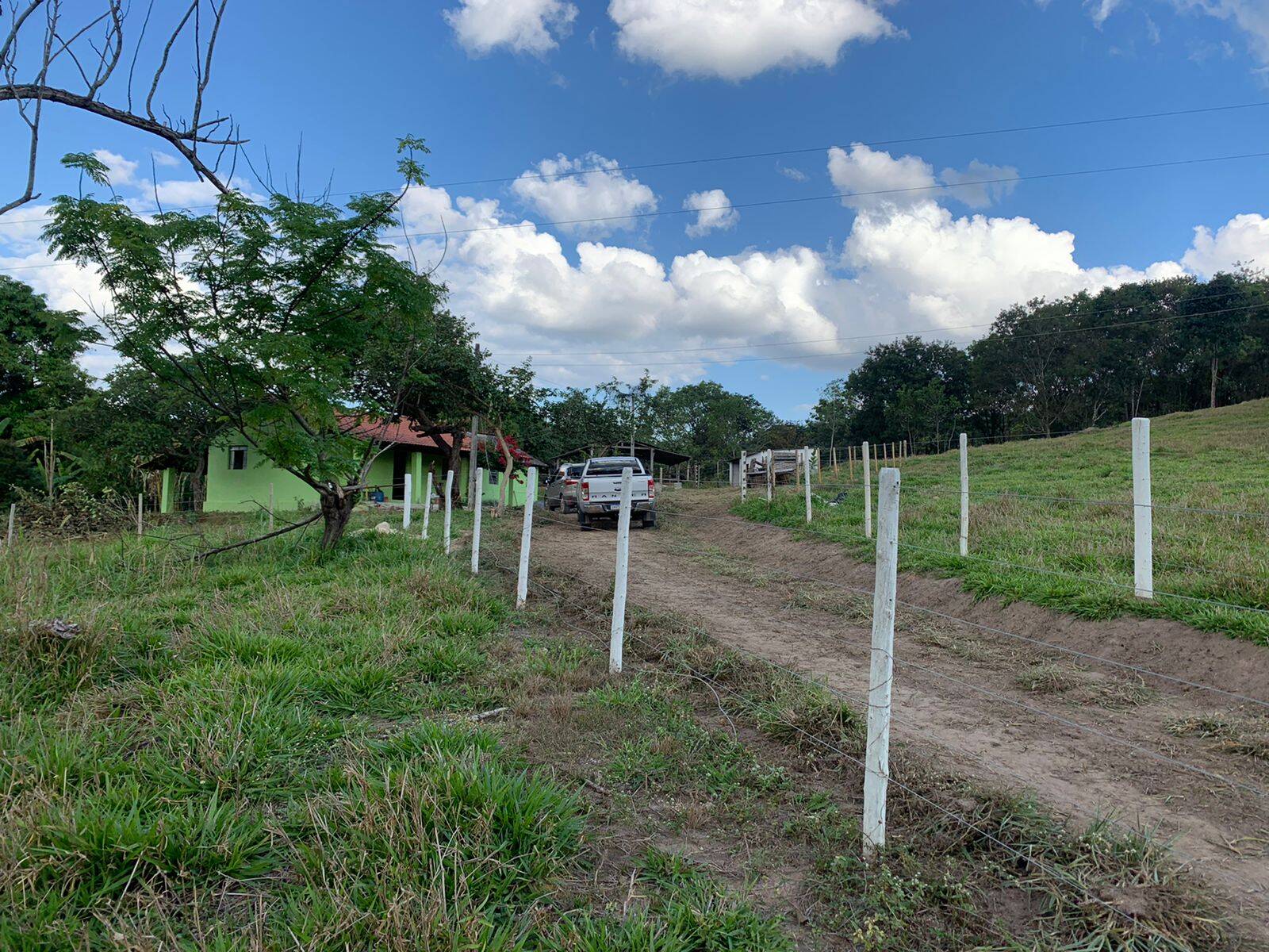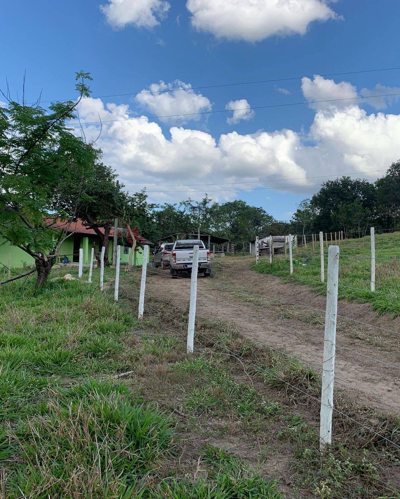 Casa com telhado colonial, varanda e garagem, 3 quartos, sala, cozinha, banheiro, quarto de despensa, fogão à lenha, curau, poço artesiano, nascente, luz com transformador.
