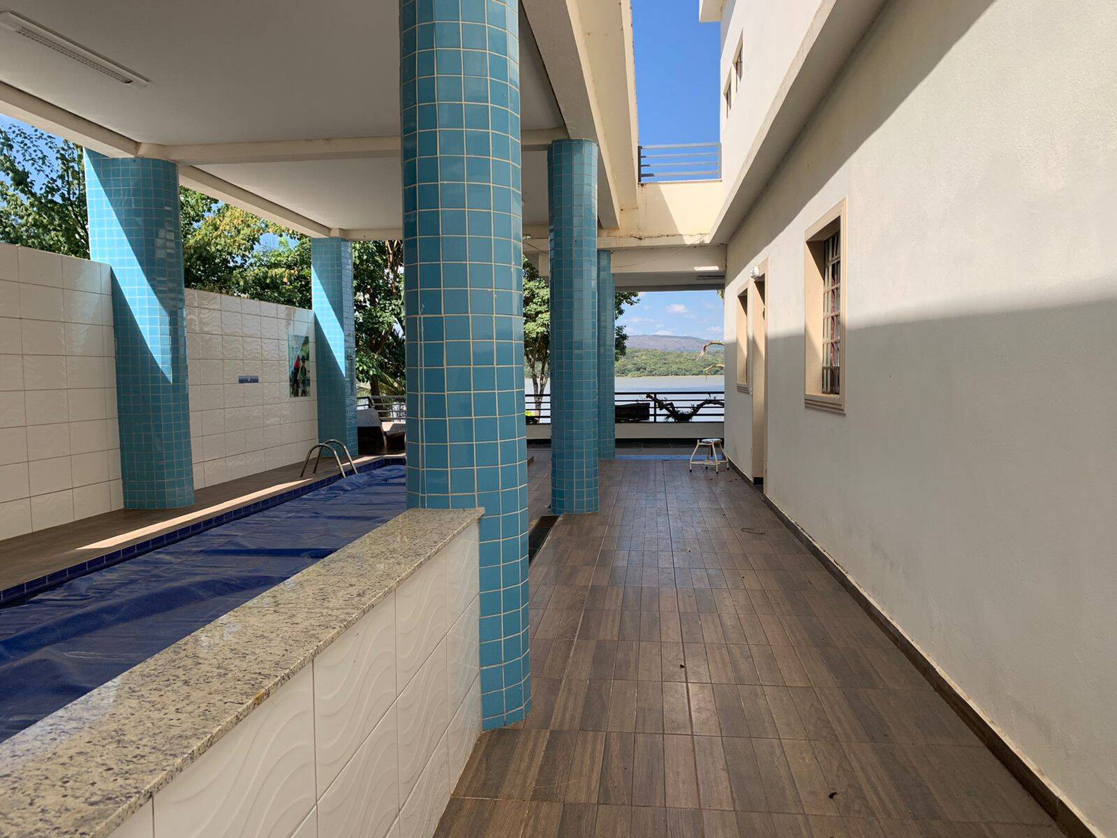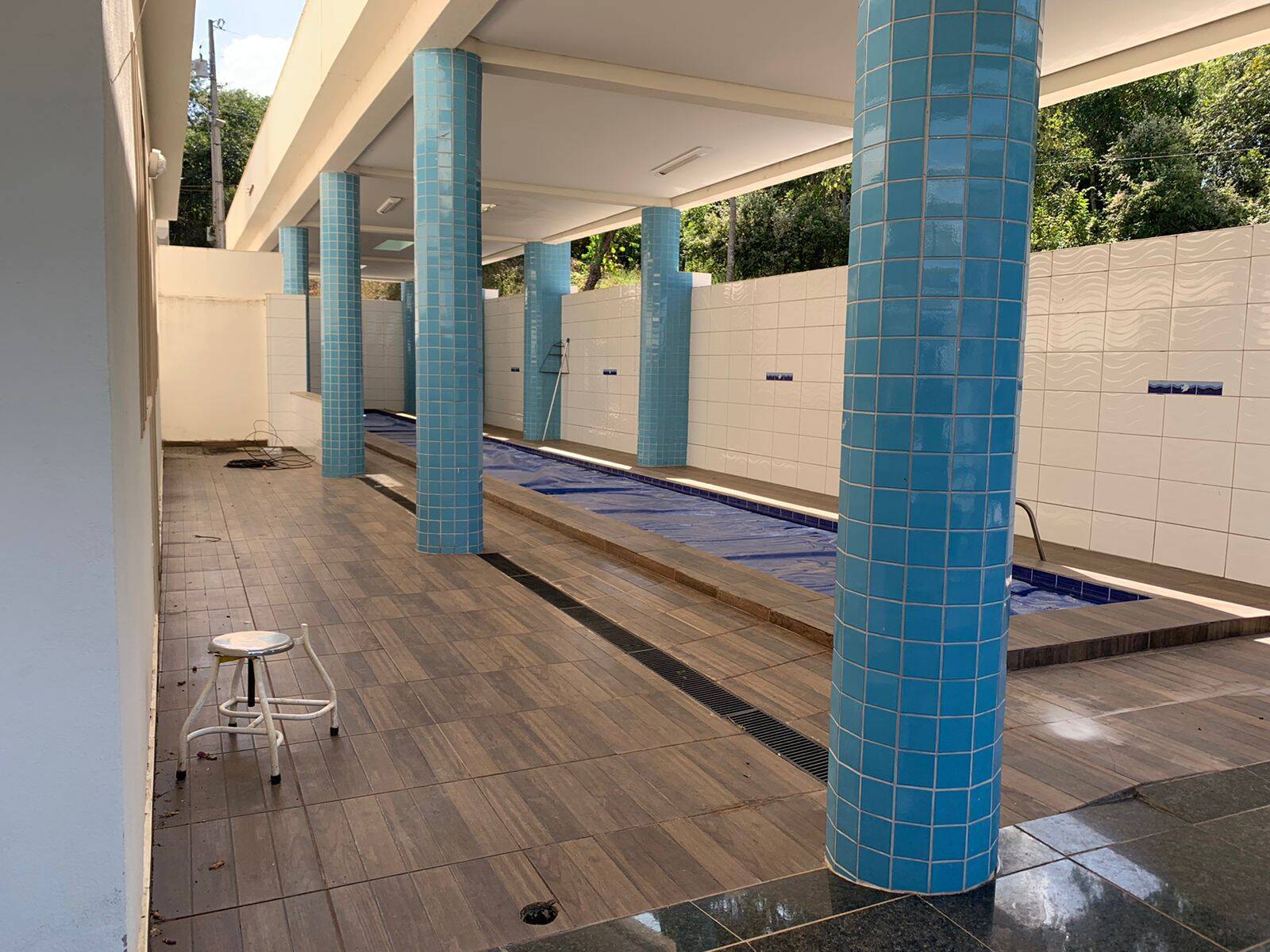 Piscina "coberta" aquecida com raia de 25 metros de comprimento, 1,5m de profundidade, casa de máquinas e área de depósito.